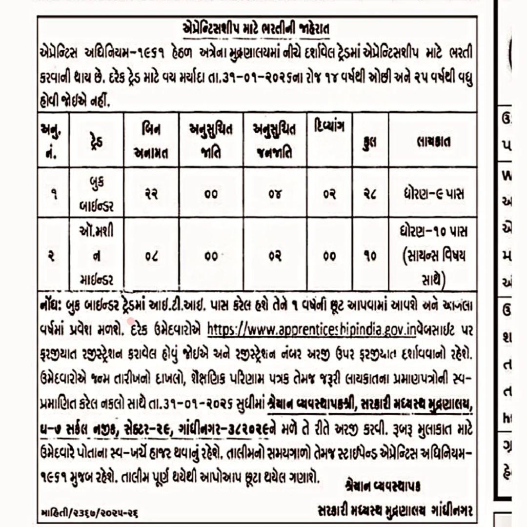 Government Press Gandhinagar Recruitment 2026 : – The Government Central Printing Press (Sarakaari Madhyastha Mudranalay), Gandhinagar, has officially released the notification for Apprenticeship Recruitment 2026. The department invites applications from eligible candidates for engagement as apprentices under the Apprentices Act, 1961.
