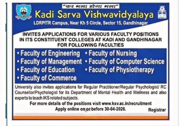 Kadi Sarva Vishwavidyalaya Recruitment 2026 :- Kadi Sarva Vishwavidyalaya (KSV), a renowned educational institution based in Gandhinagar, has officially released a recruitment notification inviting applications for various faculty positions in its constituent colleges located at Kadi and Gandhinagar campuses. This recruitment drive aims to fill teaching roles across several disciplines including Engineering, Management, Nursing, and Computer Science.