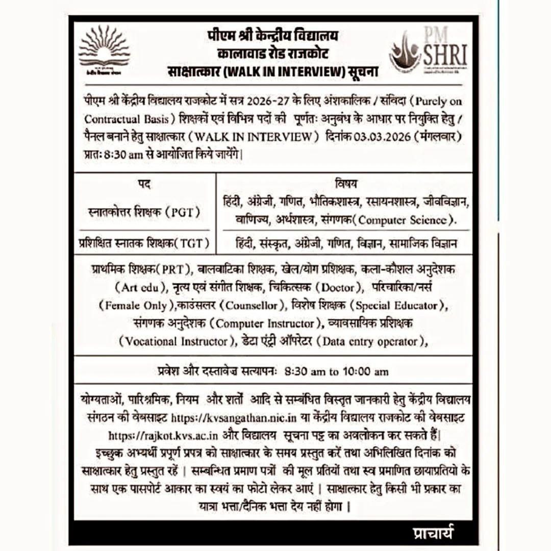 The PM SHRI KV Rajkot Recruitment 2026 offers a great platform for educators to gain experience in a central government-run school environment. Given the wide variety of posts available, from PGTs to Data Entry Operators, many job seekers in Rajkot and surrounding areas can benefit. Make sure to prepare your teaching demos and subject expertise thoroughly before the walk-in interview on March 3rd. Good luck to all the aspirants!