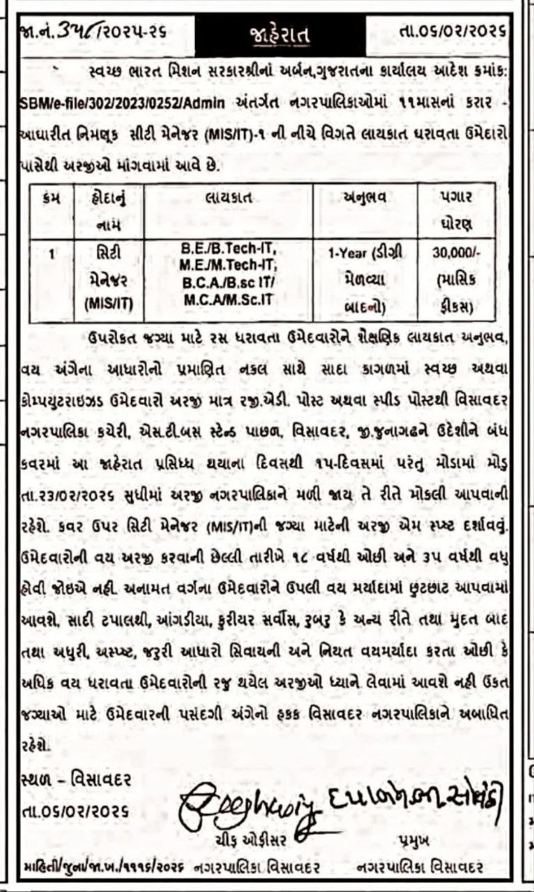 • The recruitment is for 01 post of City Manager (MIS/IT) in Visavadar Nagarpalika.
